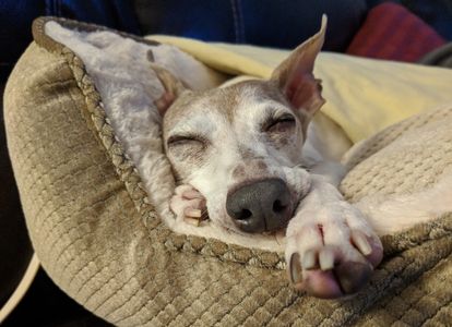 Our sweet Dee Dee, the second oldest dog in our crew at 15 years old. Her history was a little more complicated than Macie and Jay Jay's. We had known her since she was a puppy as she was a family members dog, but due to unfortunate circumstances they could no longer care for her at the level Dee Dee needed. She actually stayed with us a few times throughout her life and was raised around both Jay Jay and Macie but didn't officially join the crew until around 4 years ago and had to immediately undergo a major dental procedure where they pulled all but 9 of her teeth to save her from the severe infection caused by dental disease. She recovered well and became my shadow/velcro dog, she was an absolute sweetheart who loved to be doted on, cuddled, and next to me as much as possible. She was diagnosed in March 2017 with the early signs of kidney disease, we were able to treat her with meds, prescription diet, subcutaneous fluids from home, and an herbal blend which gave us years longer with her than our vet ever thought possible in her original condition. She was laid to rest in the comfort of our home (home vet visit) in July 2019. Her favorite things were being wrapped up in a blanket, napping with the crew, and she thrived off constant love and attention. We will always miss you our sweet precious Dee Dee girl.